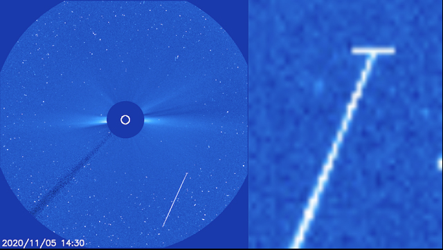 2020年11月5日、NASAの太陽圏観測機(SOHO)が写真に収めた太陽の近くで光線を放っている巨大な円柱状の物体。(www.nascom.nasa.gov;helioviewer.org)