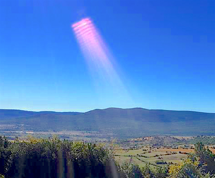 スペイン──2021年10月8日、旅行者がソリア付近で風景写真を数枚連続して撮影した。後で見返したとき、そのうちの1枚だけに、明るい光線を放つ、光る複数の円盤からなる物体が写っているのを発見して彼女は驚いた。