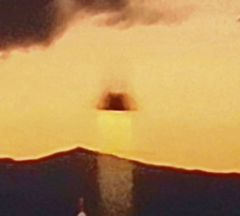後で見直すと、蒸気か光を発するベル形状の空中物体が写っていた。(拡大画像)