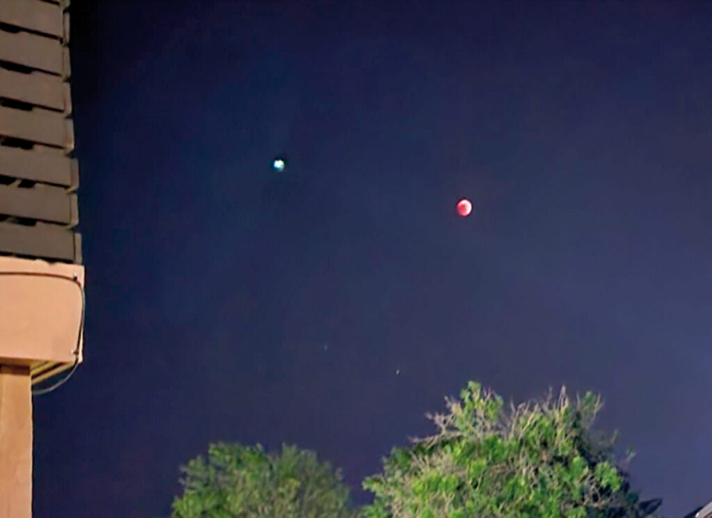 アメリカ── 2022年5月15日の夜、テキサス州アマリロで月食中に撮影された赤い月。光る星のような物体が視界に現れるとほんのしばらくの間、浮遊していた。「ビデオを撮ろうとしたら南の方角へ飛んで行ったよ」と目撃者は語った。(mufon.com)