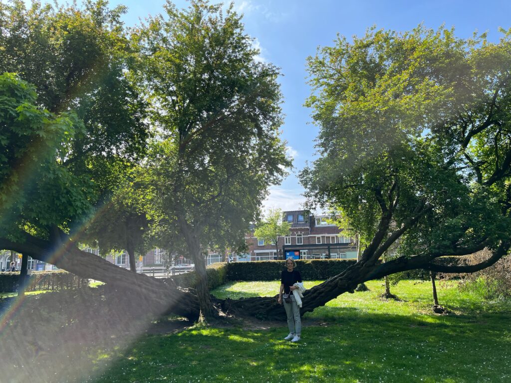 このサンドラの写真は、ユトレヒトの公園でのある晴れた日の散歩途中に撮られたものです。その日の散歩前に、私たちは『いのちの法則』にあるマイトレーヤの教え、とりわけ、次の美しい教えについて話していました。「あなたの庭を見てごらんなさい。美しい花々を賞賛しなさい。庭は多様性があるときにのみ美しいのである。創造(被造物)の中には七つの色がある。一色でも欠けるならば光はない。あなたは、信仰を受け入れるために、または拒絶するために、ここにいるのではない。七つの異なった色すべてを経験するためにいるのである。そのようにして、あなたの知識と知恵は増えるだろう」。マイトレーヤの教えは私に虹を想起させました。そして、もしそのうちの一色を外すことができたら、虹全体が消え失せてしまうということも。それぞれの異なった色は、境界の存在しない同じ光の反映だからです。私たちは帰宅後に写真を見返して驚きました。写真のサンドラの横に、虹を思わせる光のカーブが写っていたからです。