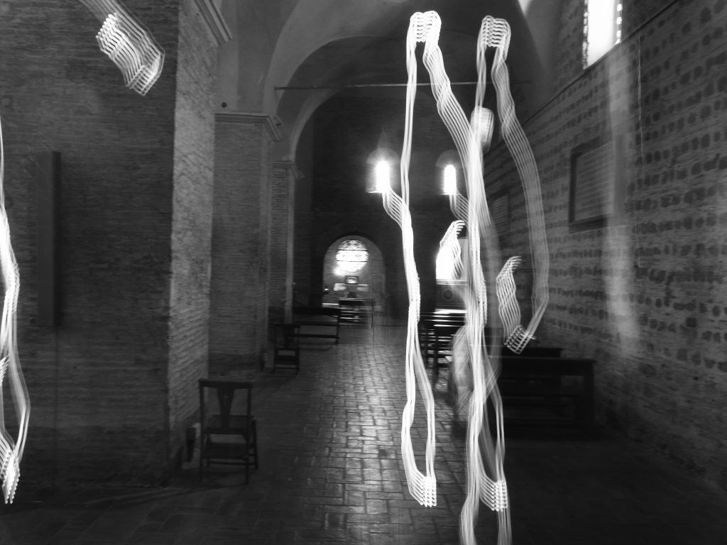 2009年10月にダミアン神父の列聖のためにローマを旅行中、サン・パオロ・フオーリ・レ・ムーラ大聖堂で写真を1枚撮影しました。自宅で写真に、二人の人物が歩いているのを思わせる光の線があるのに気づきました。私が教会に滞在していた間、信徒席には祈りを捧げている男性が一人いました。写真には彼の姿が見えていませんが、彼の座っていた場所に(写真を撮った時、彼が確かにそこに座っていたことは分かっています)、光が見えているのです。私が教会にいた間中ずっと、その男性はそこに座ったままで、別の写真では彼が信者席に座っているのが分かります。私はそこで祈り、すばらしい平安を体験しました。