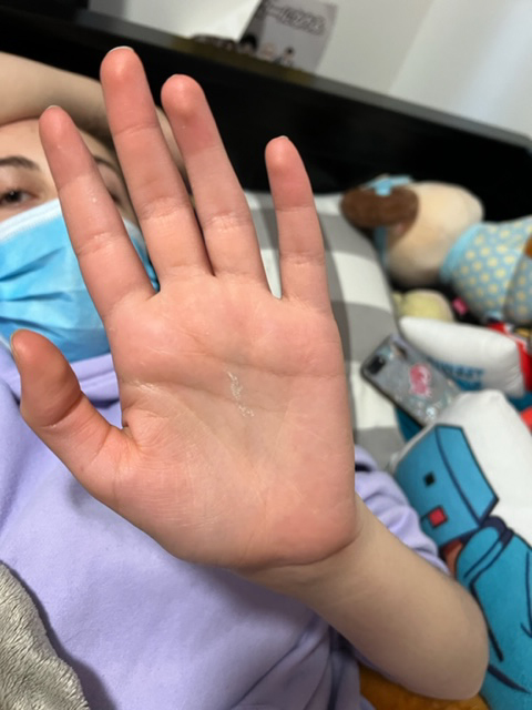 携帯電話を持って戻り、彼女の手を見ました。ビブーティは戻っていました。同じ場所に、同じ細い線になっていました。私は娘の手の写真を撮り、それからビデオ撮影もしました。